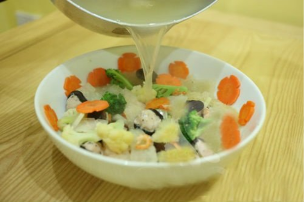 Chọn một chiếc chiếc tô thủy tinh đẹp, lần lượt xếp rau củ vào đáy tô, sau đó xếp bóng thả, giò, tôm lên trên rồi cho nước dùng vào. Có thể thêm ít ngò hay hành lá để món ăn trông hấp dẫn hơn.