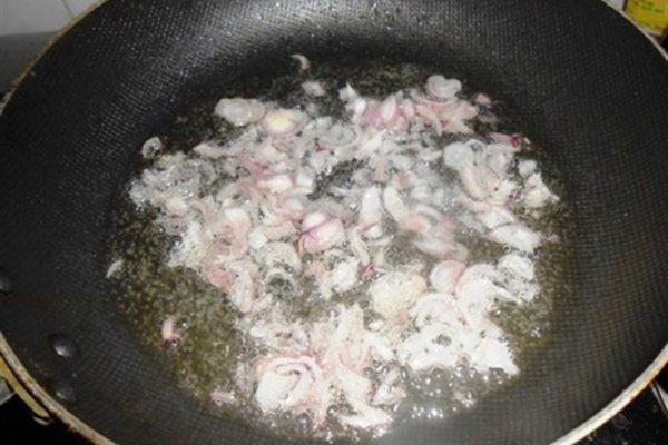 - Hành tím bóc bỏ vỏ, thái lát mỏng, phi vàng,