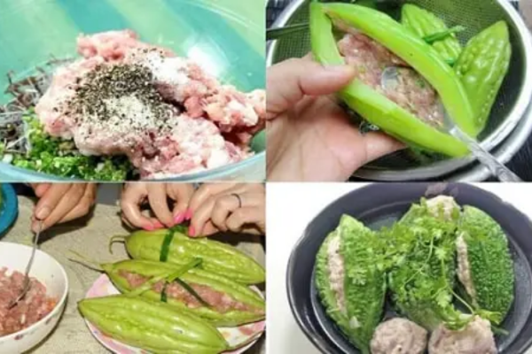 - Thịt lợn xay trộn với giò sống, ướp gia vị, nhồi vào khổ qua.