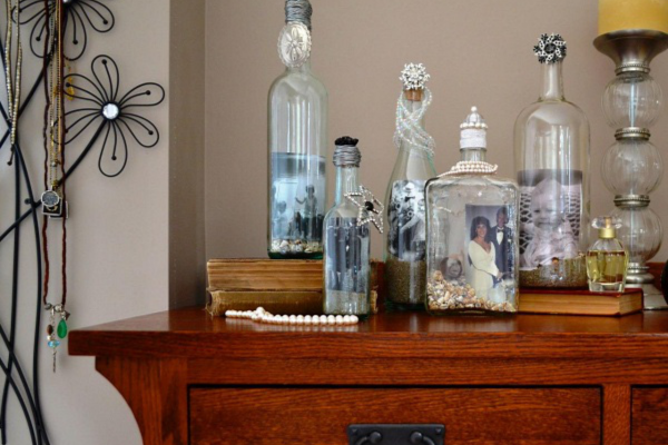 Hay đơn giản là lồng một bức ảnh vào những chai thủy tinh đẹp, trang trí xung quanh vài sợi dây màu là bạn đã được một “khung ảnh” trong suốt, lung linh. Bạn có thể tùy thích để chúng ở trên bàn, trong tủ kính hay gói vào hộp quà tặng một người bạn cũng là ý kiến không tồi. Những chiếc chai lọ không sử dụng tưởng chừng có thể vứt đi nhưng tái sử dụng thì cũng rất tuyệt vời và đặc biệt.