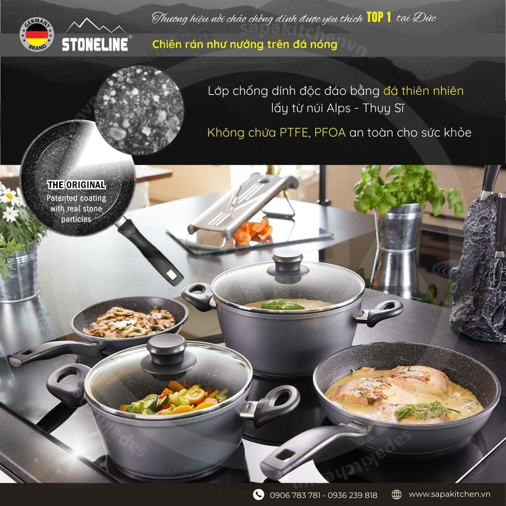 Stoneline là thương hiệu nổi tiếng thế giới của Đức trong lĩnh vực sản xuất dụng cụ nhà bếp chống dính như: Nồi chảo, khay nướng, vật dụng nấu nướng. Với giải thưởng Top 1 sản phẩm do người tiêu dùng tại Đức bình chọn 2017 và nhiều giải thưởng khác, hiện nay Stoneline đã có mặt trên 64 quốc gia trên toàn thế giới. Các sản phẩm của Stoneline được sản xuất trên dây chuyền công nghệ hiện đại, sử dụng những nguyên vật liệu an toàn, thân thiện với môi trường nhằm đảm bảo sức khỏe của người sử dụng, sản phẩm có độ bền cao cho thời gian sử dụng lâu dài.