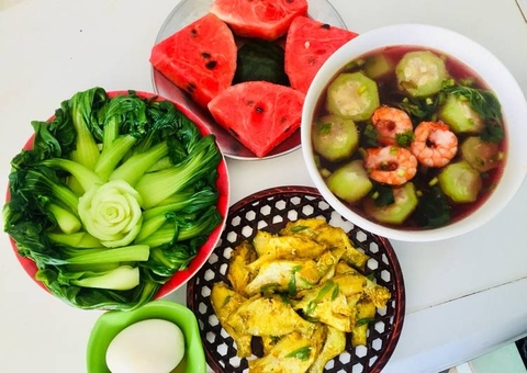 - Thứ 5: Cơm + Đậu bắp luộc + Thịt kho trứng cút + Bí đỏ luộc + Hoa quả