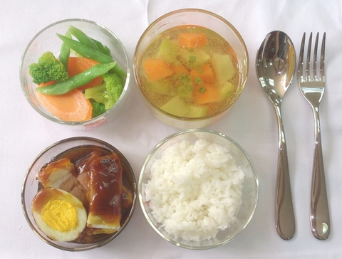 - Thứ 3: Cơm + Thịt nạc luộc + Canh Thịt băm + Hoa quả theo mùa