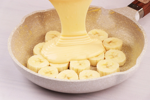 Với chiếc chảo chống dính quen thuộc cùng với những nguyên liệu vừa chuẩn bị, chúng ta sẽ tiến hành làm bánh chuối qua 3 bước đơn giản sau: