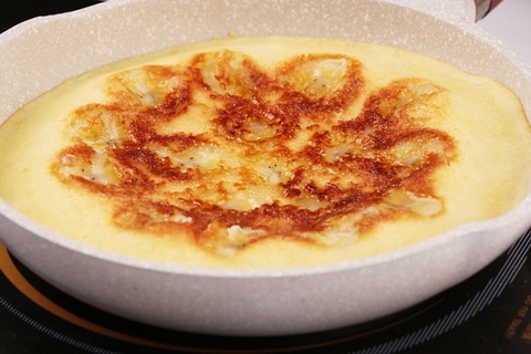 - Tiếp đó, bạn rải đều 1 lớp chuối cùng bột lên mặt chảo, để khoảng 10 phút rồi trở lại.