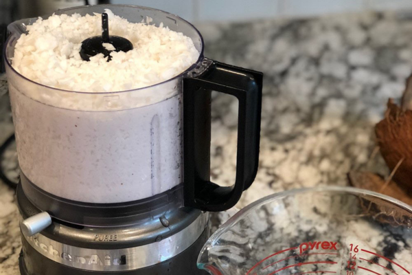 Bước 3: Cắt thịt dừa thành miếng nhỏ hoặc xé thịt dừa bằng nạo.