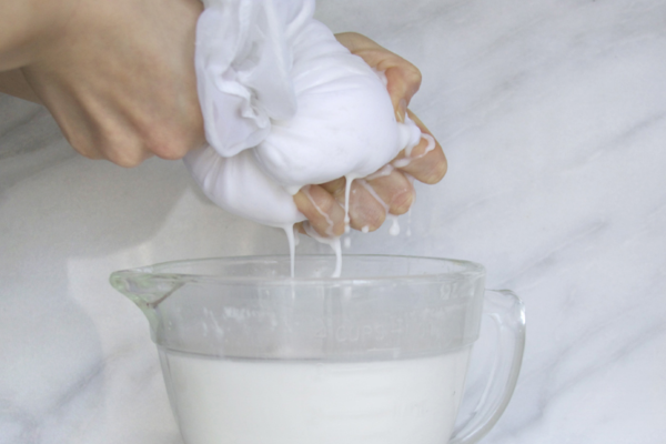 Bước 6: Lọc lấy nước cốt dừa. Đặt một bộ lọc cà phê hoặc vải mỏng trên một cái miệng rộng.