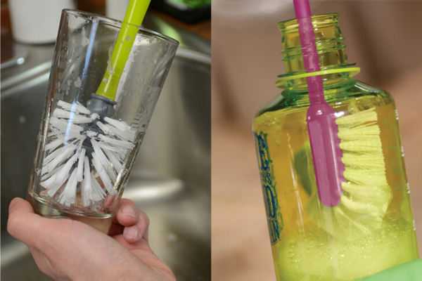 - Với các đồ dùng như hũ, chai lọ, bình nước thủy tinh... bạn nên dùng cây rửa chuyên dụng hoặc có thể dùng đũa luồn miếng cọ rửa mềm vào cùng nước tẩy rửa để làm sạch chúng.