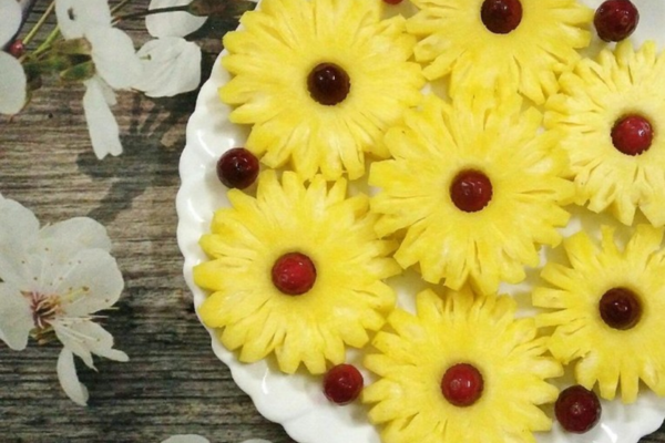 - Dứa gọt bỏ vỏ và phần mắt rồi cắt khoanh tròn và tỉa thành cánh hoa;