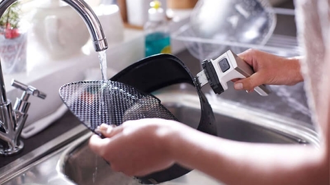 Bạn pha một ít xà phòng cùng với nước ấm, sau đó tẩm vào miếng rửa chén để vệ sinh chảo, khay nướng và rổ chiên của nồi chiên không dầu. Nếu có điều kiện, bạn có thể sử dụng máy rửa chén để vệ sinh để khử bỏ mùi hôi và vi khuẩn.