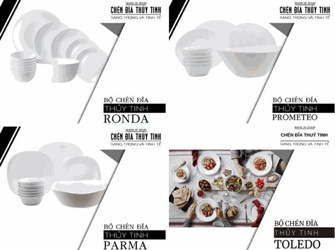 Bộ chén, dĩa, tô thủy tinh cao cấp từ tròn, vuông, oval đến những mẫu có hoa văn tinh tế, đẹp mắt.