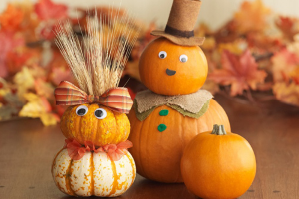 - Sau khi keo khô, bạn dán mắt, áo, mũ cho gia đình bí ngô để trang trí nhé!