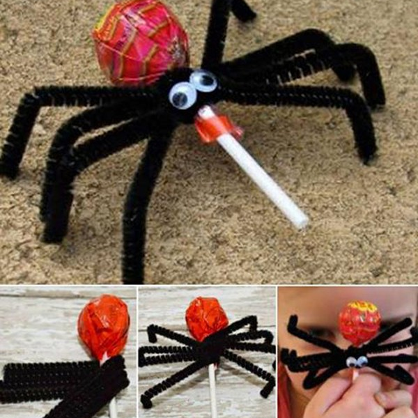 Các bạn cắt dây thép bọc nhung thành 4 đoạn bằng nhau rồi quấn quanh thân kẹo mút. Sau đó, tách ra sao cho giống với chân nhện là được.