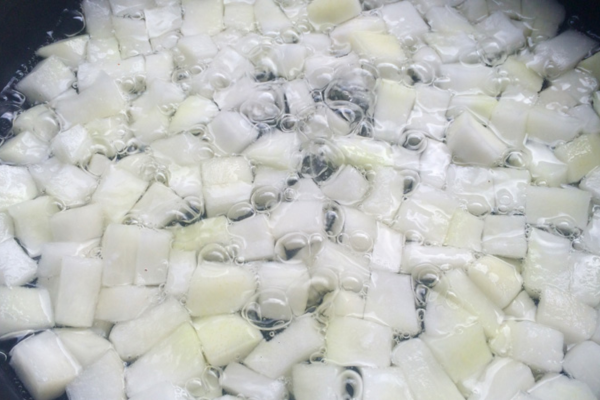 Bắc một nồi chống dính khác lên bếp, đun sôi nước rồi cho phần cùi bưởi đã áo bột vào luộc đến khi thấy màu trong thì vớt ra. Cho ngay chúng vào thau nước lạnh để cùi bưởi giòn hơn.