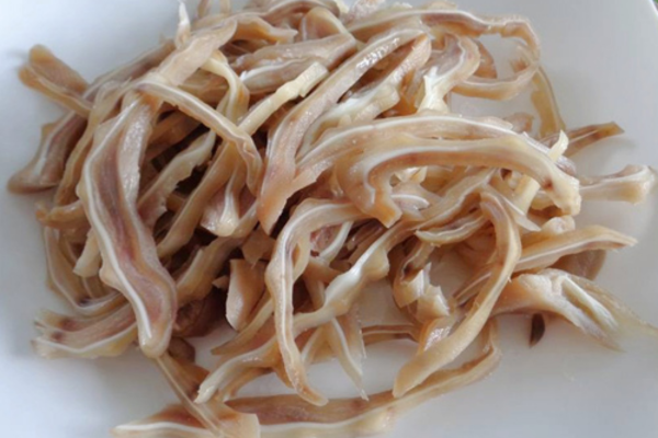 Bước 2: Tai heo mua về đầu tiên bạn rửa sạch bằng nước muối. Sau đó, bắt lên bếp một nồi thủy tinh lớn, đổ nước khoảng ngập hết tai heo rồi đun sôi. Chần sơ tai qua nước sôi một lần rồi luộc chín. Bạn vớt ra đĩa (có thể dùng loại đĩa thủy tinh đựng trái cây), để nguội bớt rồi thái thành sợi vừa ăn.
