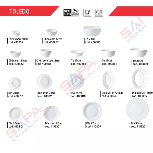 Dòng sản phẩm chén đĩa thủy tinh Toledo của hãng Bormioli Rocco với thiết kế đơn giản hình tròn trơn không hoa văn, lòng đĩa với gờ nổi bo tròn tinh tế là điểm nhấn nổi bật lên toàn bộ thiết kế sẽ tô điểm cho không gian bếp nhà bạn, đồng thời góp phần làm tôn thêm vẻ đẹp mắt cho các món ăn ngon, giúp xếp thức ăn dễ dàng. Chất liệu bằng thủy tinh chịu nhiệt, an toàn không chứa chất hóa học hữu cơ, nên hoàn toàn yên tâm khi sử dụng vì không phải lo lắng chất hóa học sẽ theo thức ăn vào cơ thể. Bề mặt đĩa mịn màng không bám màu bám mùi thực phẩm, dễ dàng chùi rửa, tiết kiệm thời gian dọn dẹp.